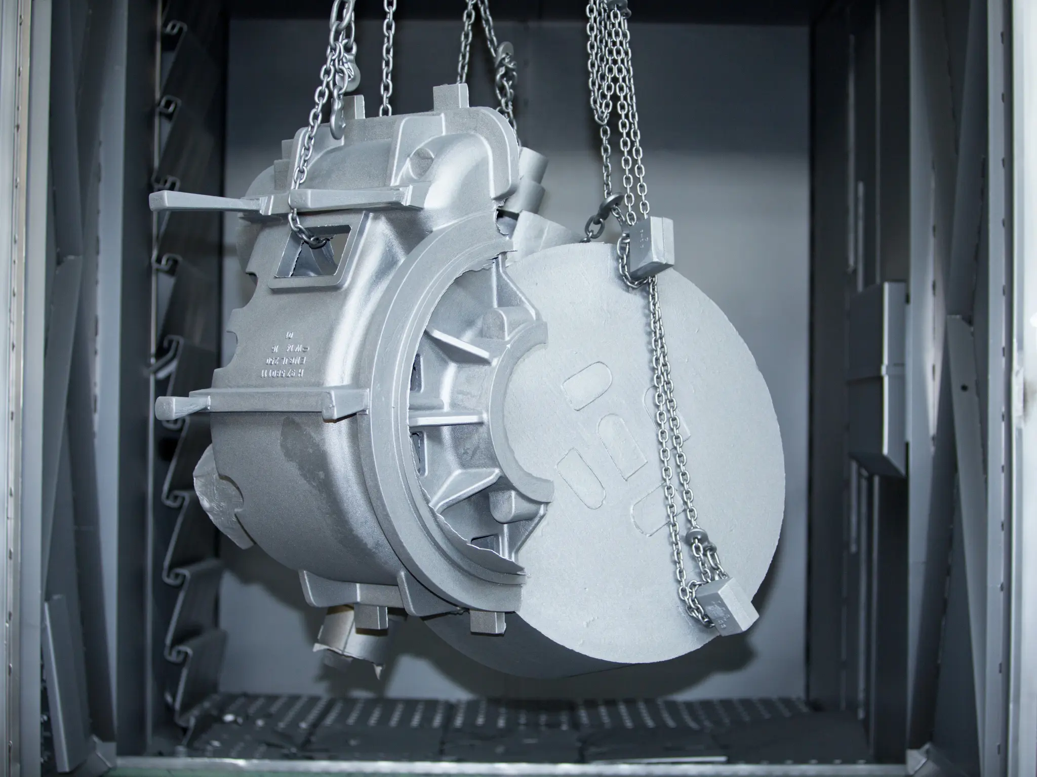 Nach dem Erstarren und Entformen werden die Gussteile in der Strahlanlage gereinigt. Dabei werden Sandreste, Grate und Anhaftungen entfernt, um eine saubere Oberfläche für nachfolgende Bearbeitungs- oder Beschichtungsschritte zu schaffen.